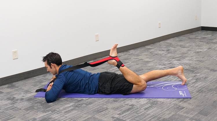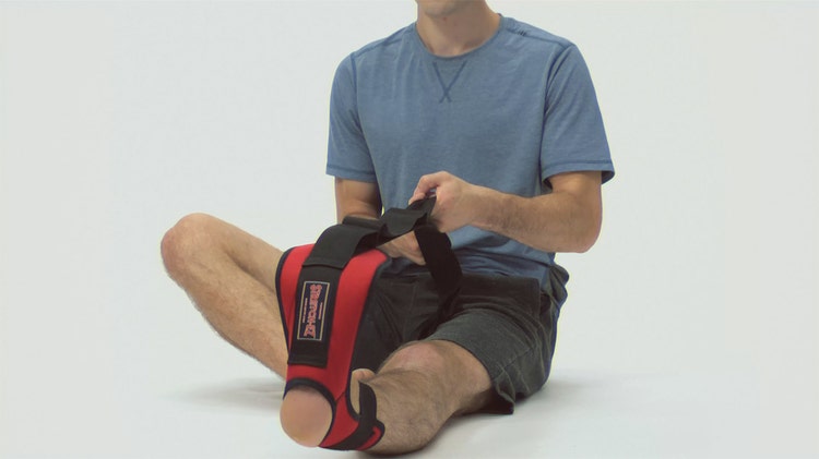 This configuration is used to stretch the quadricep. It features the foot inserted in the opening, and the hook and loop strap around the ankle.
