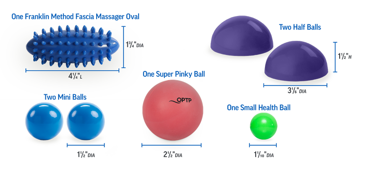 Alleviate tension and soothe sore muscles with this bundled set that includes a variety of options for massage across the entire body. The set includes one Super Pinky Ball, two OPTP® Half Balls, two Mini Balls, one Franklin Method® Fascia Massager Oval, and one Small Health Ball. This bundled package includes a mesh carrying case, convenient for travel.