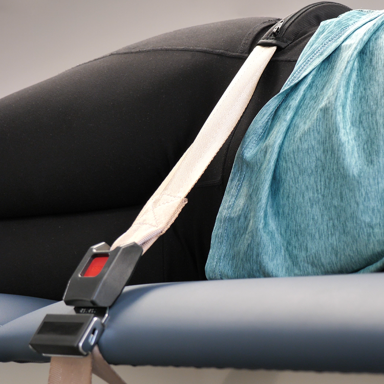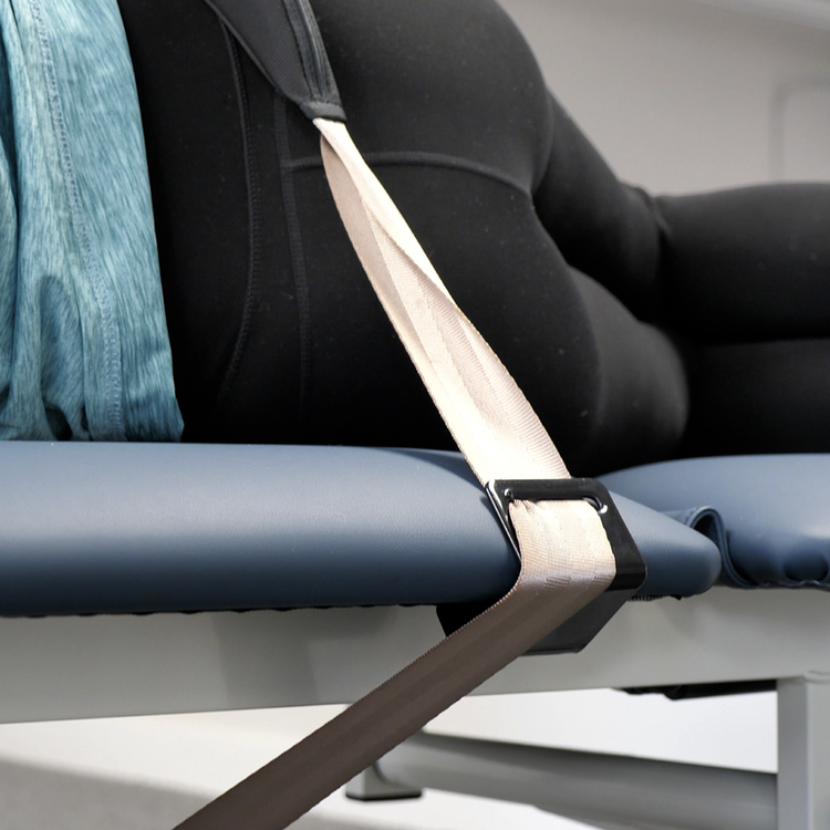 This 8’ long strap features a one-hand push button release buckle and a sturdy J-hook that firmly attaches the strap to most treatment tables.