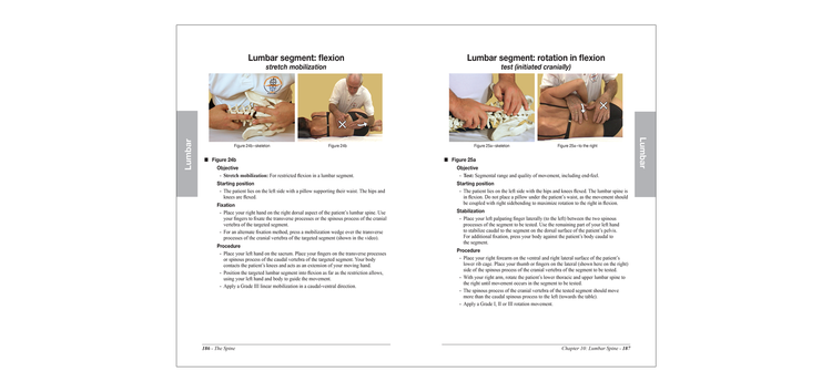 - Technique principles for the pelvis, lumbar spine, thoracic spine and ribs, cervical spine, upper cervical spine and jaw