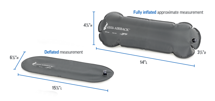 Easily inflated and deflated for the perfect travel companion, the Original McKenzie® AirBack™ Inflatable Support provides quick lumbar support as well as an easy-to-pack temporary replacement for a Standard or Firm McKenzie Method® Lumbar Roll. Measuring approximately 14” long x 3½” deep x 4½” high when fully inflated and 15½” long x 6½” high when deflated, it is ideal for air and car travel, as well as stadium seating.