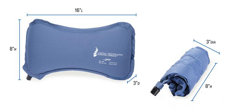 The Self-Inflating AirBack™ Lumbar Support measures 16"L x 2"D x 8"H (at tallest point) when fully inflated. When deflated and tightly rolled, it measures 8"L x 3"DIA. This support is ideal for carrying in a purse or bag for on-the-go support while traveling, at sporting events or anywhere you need added lumbar support.