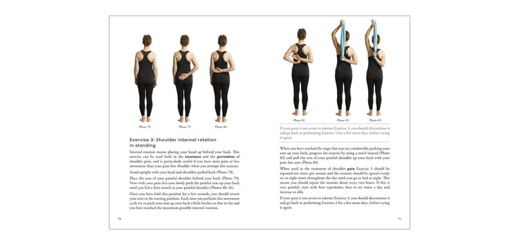 Color photos and simple step-by-step instructions show you how to perform a systematic exercise sequence with shoulder stretches that can be done just about anywhere to help treat and prevent pain. The shoulder therapy exercise program includes details on when to perform exercises, how to determine if you’re ready to move on to the next exercise, how to perform the exercises correctly, what to do when the pain has subsided, and how to prevent recurrence of pain.