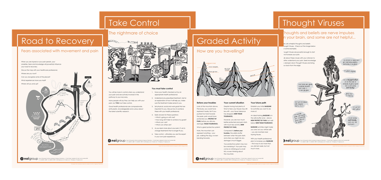 The four titles included are Take Control, Thought Viruses, Road to Recovery and Graded Activity. The posters can be used at home, in a pain peer group setting, or as an everyday educational tool hanging in the waiting room of your clinic. Sold in sets of four plasti-coated 16"W x 24"H posters. The second edition features updated content and references.