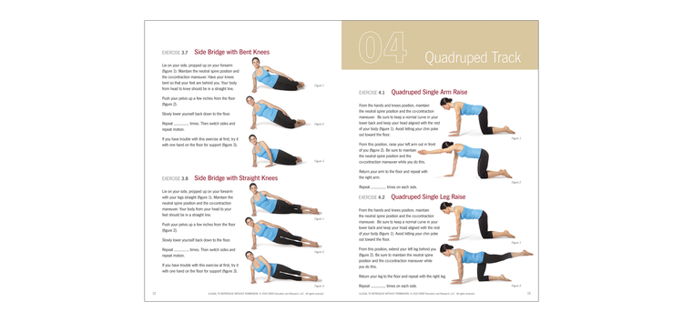 Exercises are supplemented by step-by-step instructions and color photographs demonstrating proper form. Instructions are separated into sections including Supine, Bridge, Quadruped and Lunge/Squat exercises.