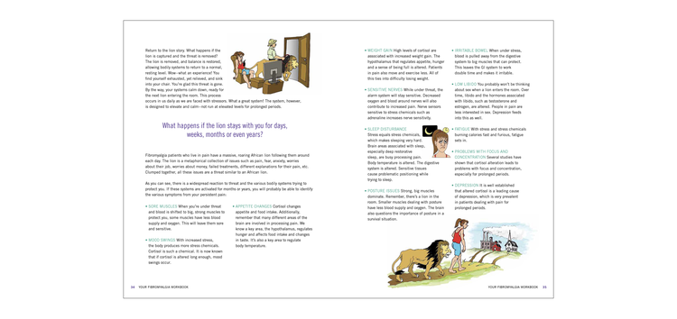 The workbook includes sections requiring reflection, discussion and application of the information to their lives, thus personalizing the pain message to their situation. The sessions include the current state of affairs for fibromyalgia patients, understanding pain in fibromyalgia, bodily systems defending in response to pain, the extra-sensitive nervous system, fatigue, treatment-plan goals and pacing activity.