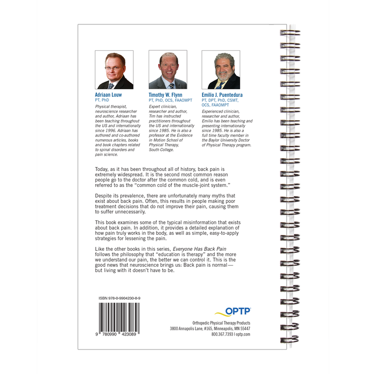 Everyone Has Back Pain was written by Adriaan Louw, a physical therapist and pain neuroscience researcher who has spent years studying pain and learning the most effective ways to help people treat and manage it. The information provided is based on research showing that you'll feel less pain, move better, exercise longer and experience more success with therapy when you understand what pain actually is and how it works in the body. This back pain book, written for people of all ages who experience back pain, examines some of the typical myths that exist about this common condition and provides simple strategies for lessening the pain.