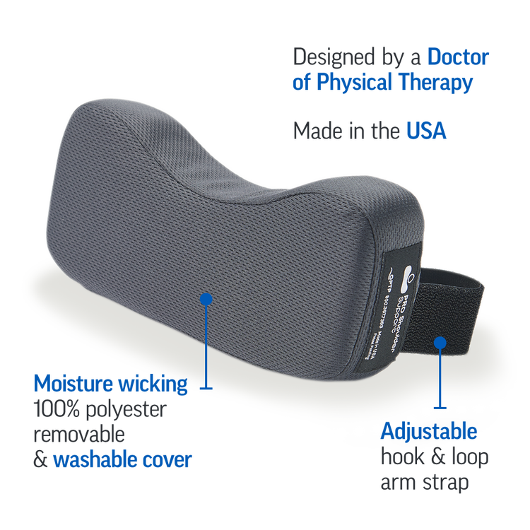 The PRO Shoulder Support® is proudly made in the USA of top-quality foam that's contoured to fit comfortably in your axilla (underarm). The cover is moisture-wicking polyester and it's easily removed for washing. Complete with a skin-friendly strap with non-slip grip.