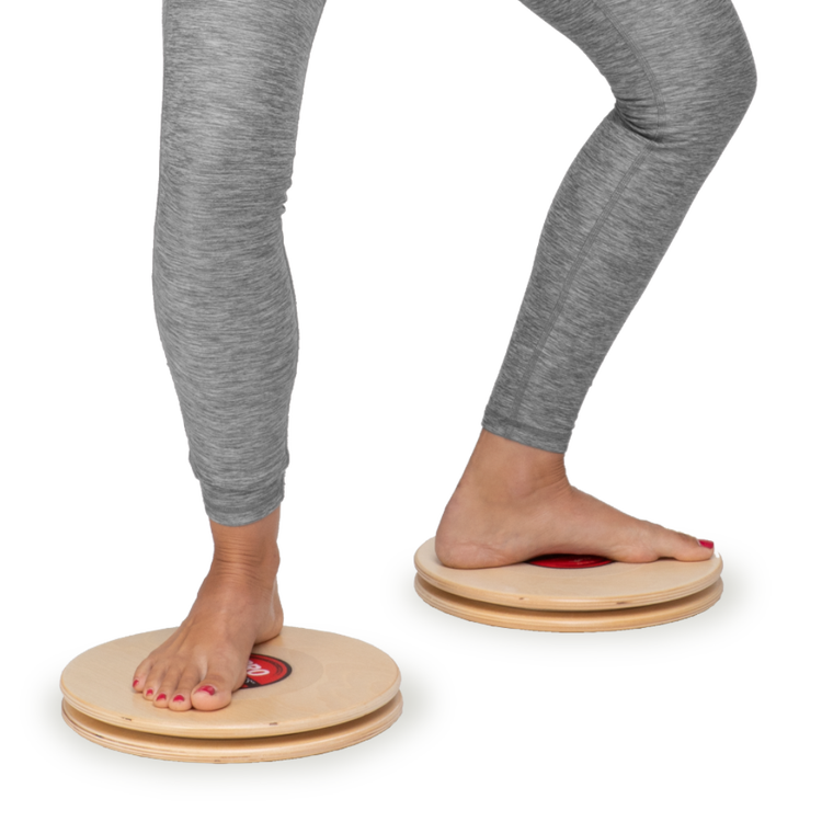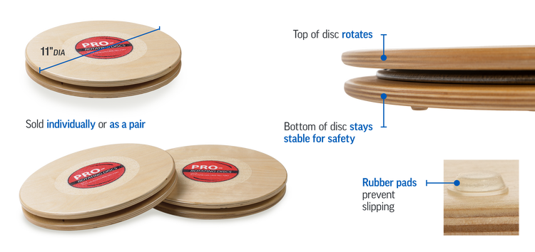 These 11" wooden discs feature 360 degrees of smooth rotation and are ideal for exercises to improve balance, core strength and mobility. Place hands on the discs for planks, push-ups, and internal/external shoulder rotation exercises. Stand on the discs for ankle training and lower body mobility exercises, including internal/external hip rotation. Lie supine with feet on the discs for bridge exercises.