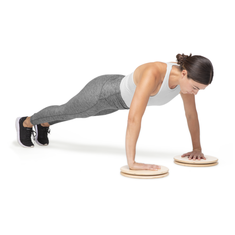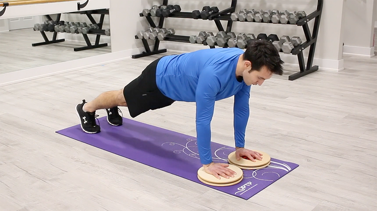 Place hands on the discs for planks, push-ups and internal/external shoulder rotation exercises.