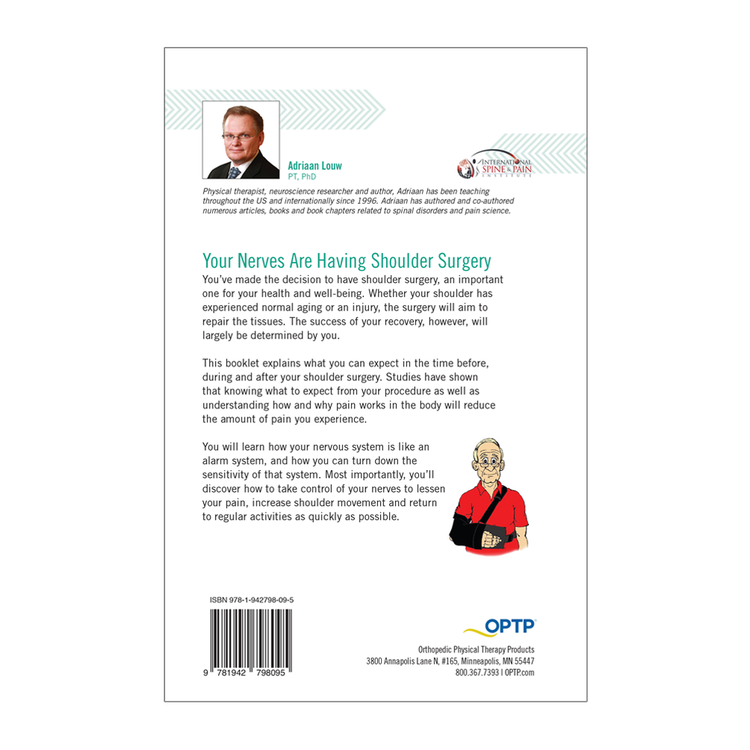 Written by clinical neuroscience researcher Adriaan Louw, PT, PhD, this shoulder surgery book is written in an easy-to-read format with illustrations for better understanding. Studies show that the more you know about pain and how it works, the better off you’ll be. You’ll move better, experience less pain and have increased ability and interest in healthy movement, which is essential to your recovery. Available as a single booklet or a package of 12.