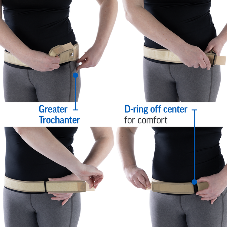 For best results, apply the SI-LOC while lying on your back on a firm surface with a pillow under your knees. Wear the SI-LOC either over your underwear or, if it tends to slip, directly on your skin. Place It at a level just above the top point of the greater trochanters of the hip.