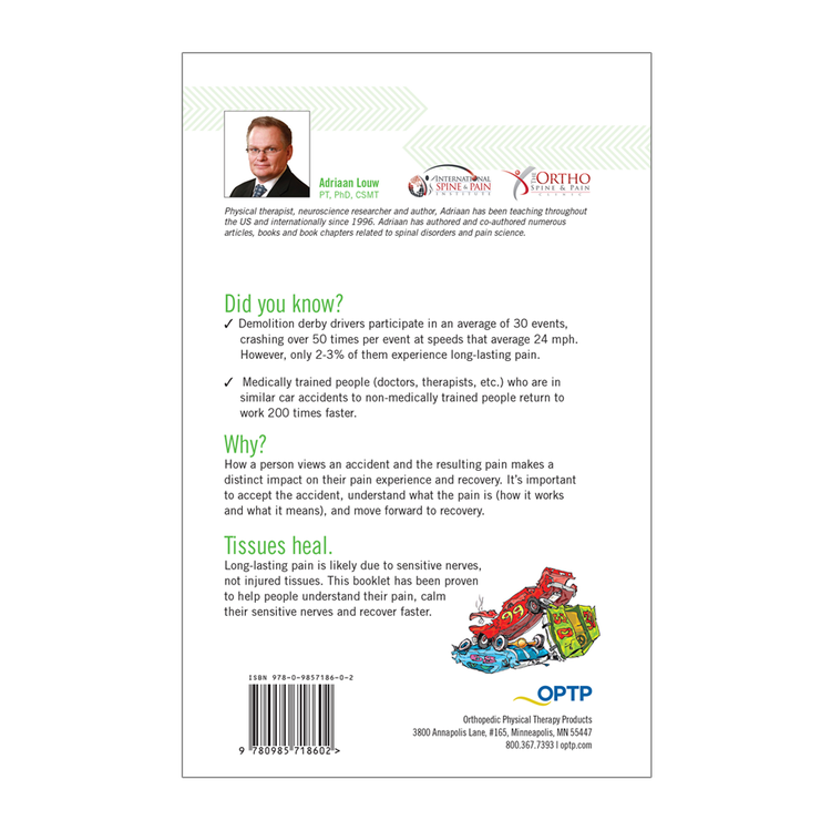 Written by clinical neuroscience researcher Adriaan Louw, PT, PhD, this book is written in an easy-to-read format with illustrations for better understanding. Studies show that the more you know about pain caused by whiplash and how it works, the better off you’ll be. You’ll move better, experience less pain and have increased ability and interest in healthy movement, which is essential to your recovery. Available as a single booklet or a package of 12.